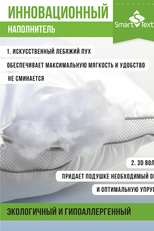 Подушка «Нимфа» - это идеальное решение для комфортного и здорового сна. Она сочетает в себе классику натуральных материалов и современность инновационных. Так, в качестве наполнителя здесь используются сразу два материала. Первый – искусственный лебяжий пух, который обеспечивает максимальную мягкость и удобство, при этом является гипоаллергенным и не накапливает пылевых клещей. Второй – 3d волокно, придающий подушке необходимый объем и оптимальную упругость.