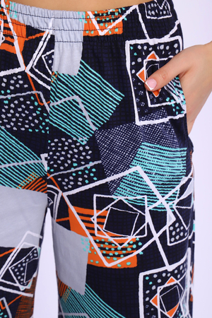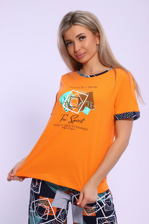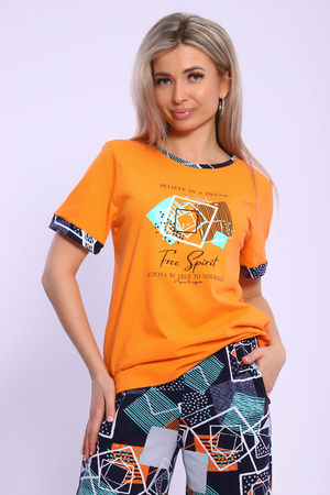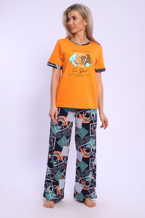 Костюм состоит из футболки и брюк. Брюки широкие с карманами. Футболка с короткими рукавами на манжетах и принтом на полочке.
