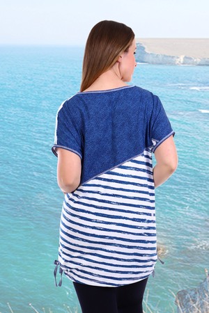 Полосатая женская туника из кулирки, прямого силуэта. Рукав короткий цельнокроенный, на полочке два накладных кармана, низ туники сбоку регулируется завязками. Кокетка спинки, правая боковая часть полочки и левый карман из трикотажа имитируют джинс.