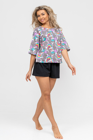 Женский модный костюм - это невероятно удобный вариант одежды для дома, сна, отдыха или пижамной вечеринки. Домашний костюм двойка сшит из натурального хлопка, лёгкого и приятного материала. Пижама состоит из свободной футболки с новым трендовым дизайном ткани и свободных шорт. Стильный костюм комфортно садится по фигуре, выглядит женственно и привлекательно, очаровывая всех. А также модель такого плана - это отличная идея для полезного и практичного подарка на день рождения, 14 февраля, 8 марта и любой другой праздник. Мы уверены, что эта хлопковая пижама подарит Вам истинное наслаждение при каждодневном использовании. Выбирайте деликатный способ стирки при температуре 30°С, тогда домашний комплект прослужит долго.