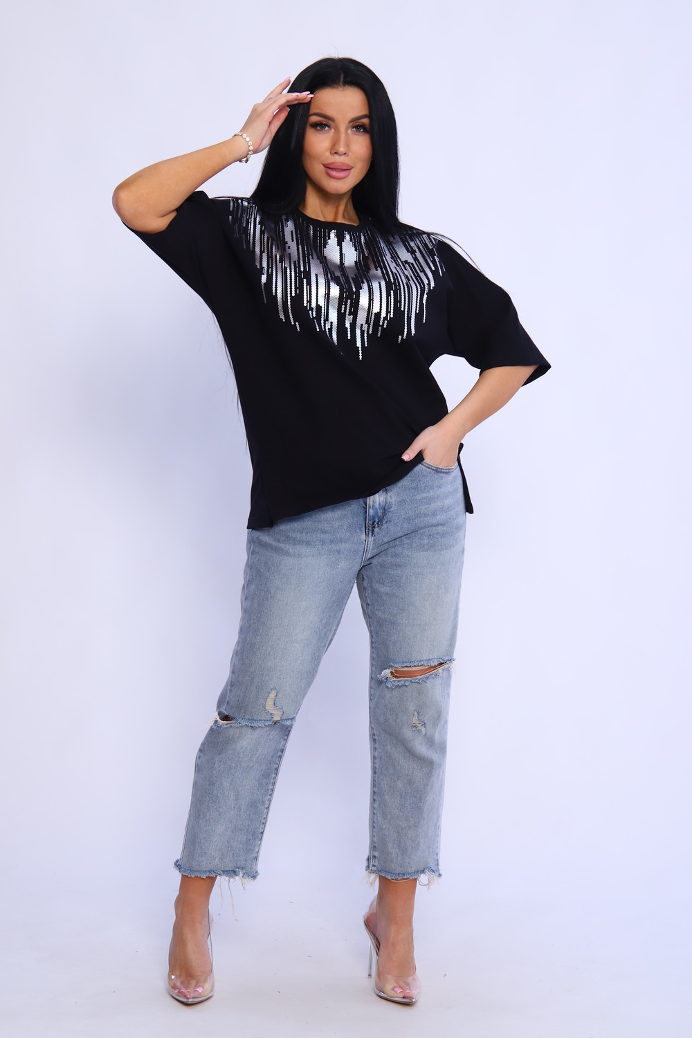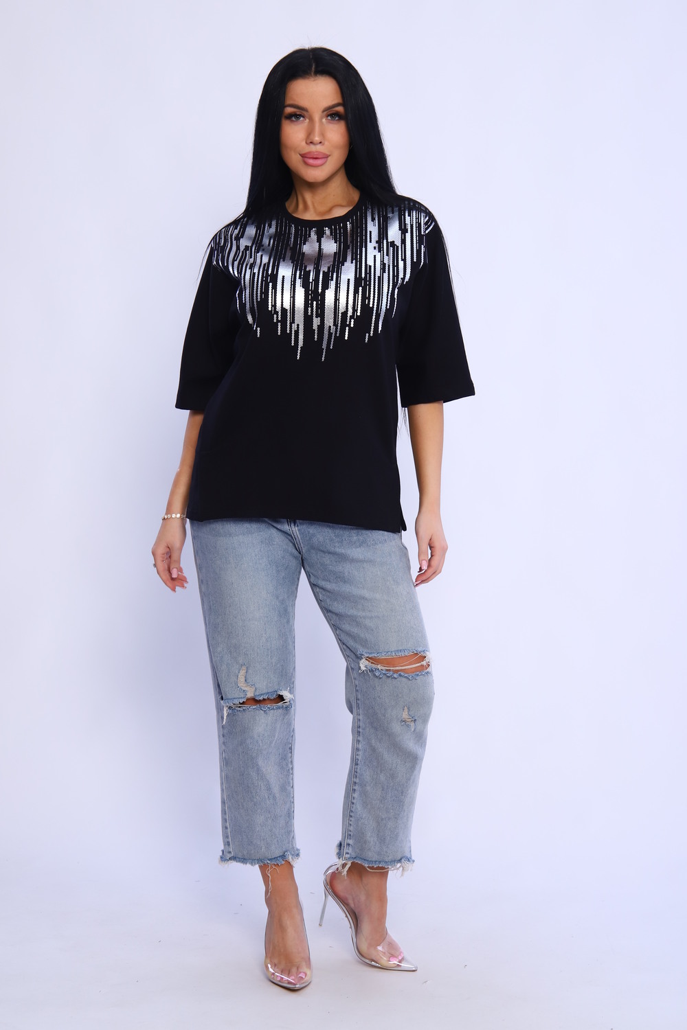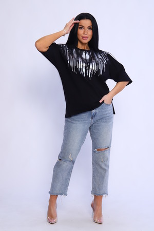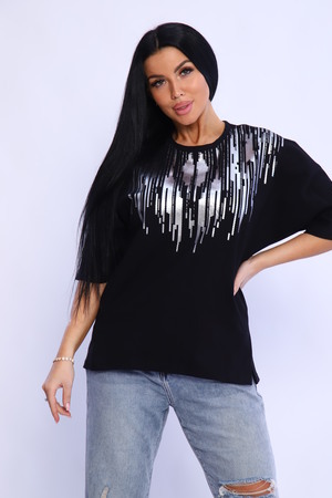 Туника женская с боковыми рельефами, переходящими в разрезы –шлицы. Незаменимая вещь в гардеробе каждой модницы. Рукав цельнокроеный, спущенный, летучая мышь, 3/4. На полочке туники выполнена печать которая прекрасно дополняет образ, придавая изделию особый шик. Крой туники "летучая мышь" из футера - отличное решение на каждый день! Свободный крой, широкая пройма рукава - модель отлично садится на любую фигуру. Туника прекрасно сочетается с брюками, шортами, юбками, джинсами. Стильно, красиво и удобно!