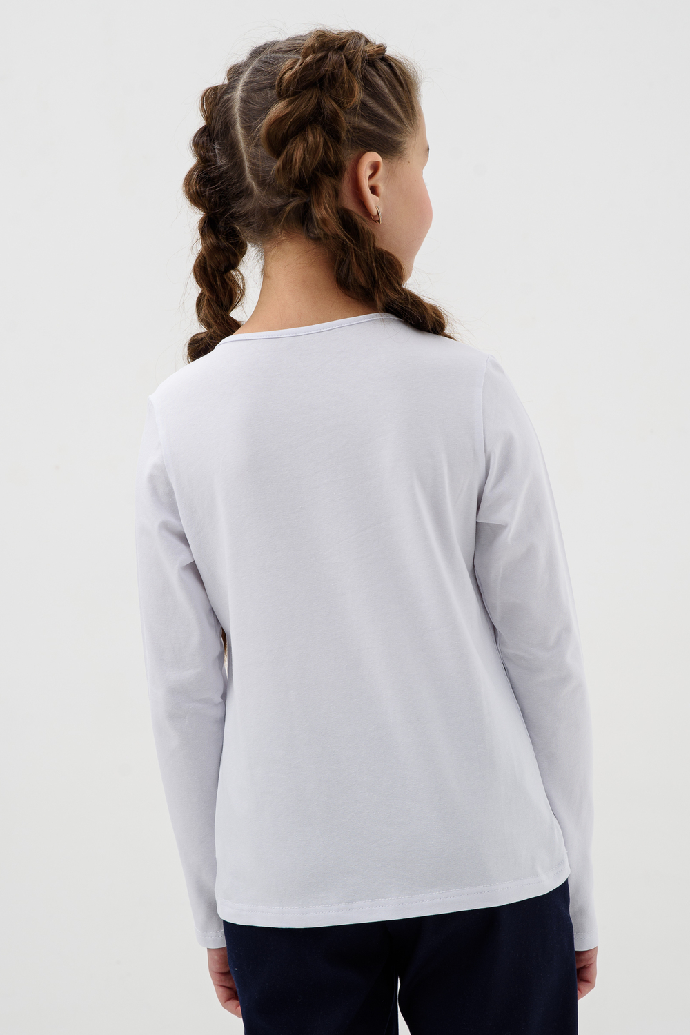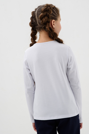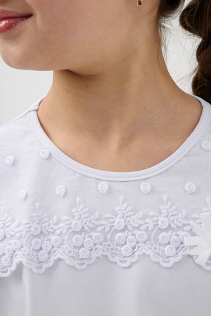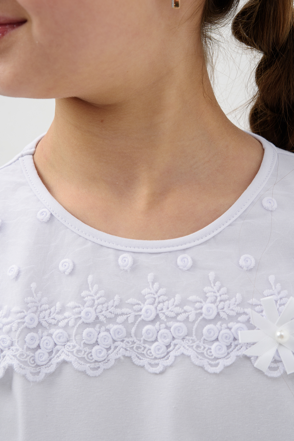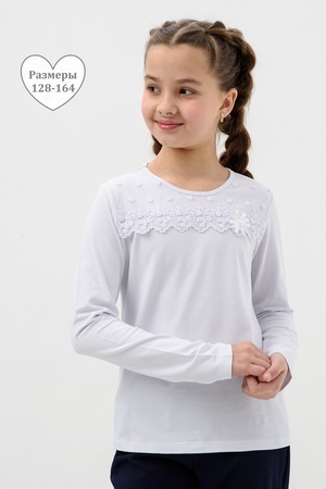 Блузка школьная для девочки с трикотажными длинными рукавами, круглым вырезом горловины, без застежки, прилегающего силуэта, на деталь переда настрочена кружевная кокетка, спереди на кружево сбоку прикреплен декоративный элемент. Сшита из однотонного мягкого хлопкового трикотажного материала с добавлением в состав хлопка 92% и лайкры 8 %. Школьная форма украсит и дополнит любой образ не только в школу, но и для повседневной носки, на день рождения, фотосессию и для особых случаев. Блузка отлично сидит по фигуре, движения в нем комфортные, позволяет выглядеть ребенку изящно. Отлично сохраняют цвет и форму при активной носке и после многократных стирок. Используемый материал блузки мягкий и приятный телу, устойчив к износу, не садится, не образует катышек на поверхности, имеет эффектный внешний вид.