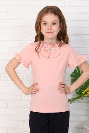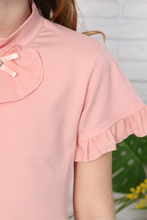 Блузка школьная для девочки с короткими рукавами (с рюшкой по низу), воротником - стойкой, жабо со складками и брошкой (не отстёгивается!), прилегающего силуэта, без застежки. Основа джемпера выполнена из кулирки с лайкрой, жабо и рюшка по низу рукава из шифона. Сшита из однотонного мягкого хлопкового трикотажного материала с добавлением в состав хлопка 92% и лайкры 8 % и шифона. Школьная форма украсит и дополнит любой образ не только в школу, но и для повседневной носки, на день рождения, фотосессию и для особых случаев. Блузка отлично сидит по фигуре, движения в нем комфортные, позволяет выглядеть ребенку изящно. Хорошо смотрится в сочетании с юбкой или брюками, со школьным костюмом, отлично сохраняют цвет и форму при активной носке и после многократных стирок. Используемый материал кофты мягкий и приятный телу, устойчив к износу, не садится, не образует катышек на поверхности, имеет эффектный внешний вид.