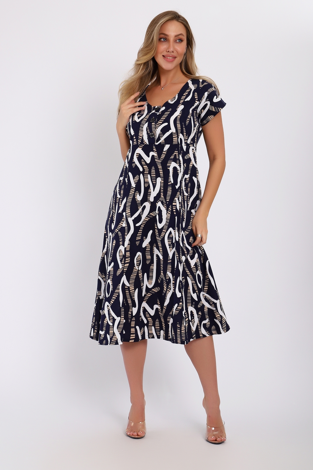 Платье женское со спущенным рукавом из кулирки 100% хлопок, с подрезом, планка на пуговицах, внизу расклешение. Идеально подойдет для прогулок и отдыха.