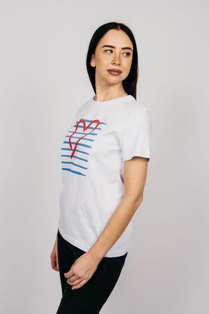 Женская футболка принт - шелкография - идеальный выбор для модных женщин, которые ищут базовую одежду. Футболка классического фасона, прямого кроя, с втачным коротким рукавом и круглой горловиной. Футболка новой коллекции подчеркнет ваш гардероб, а также идеально подойдет для создания ярких и стильных образов. Футболку будет удобно носить навыпуск или заправлять, отлично сочетается с юбкой, брюками с джинсами, а также можно одеть под пиджак, жакет или кардиган. Футболка выполнена из мягкого хлопкового полотна. Уход за изделием: стирать футболку с вещами похожего цвета и вынимать сразу после стирки. Гладить с изнаночной стороны. После стирки футболка сохранит свой первозданный вид, горловина не вытягивается, а боковые швы не ведет. Модель рассчитана на рост 164-170см. Полотно: Кулирная гладь-пенье. Состав: 100% Хлопок. Плотность 160 гр.