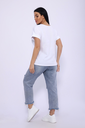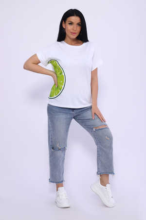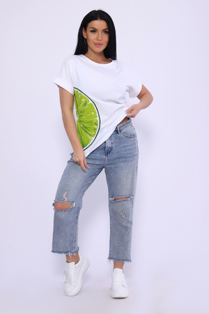 Футболка женская с ярким 3-Д принтом, из кулирки высокого качества пенье компакт. Модель свободного кроя, горловина в виде "лодочки", спущенная пройма на манжете. Стильная, приятная к телу из 100% хлопка футболка необходимая вещь в гардеробе современной девушки.