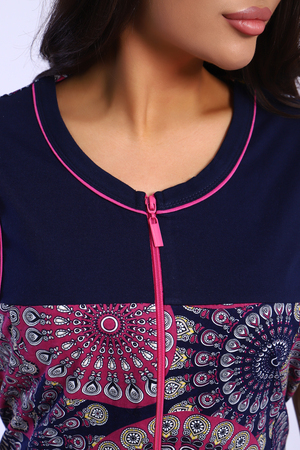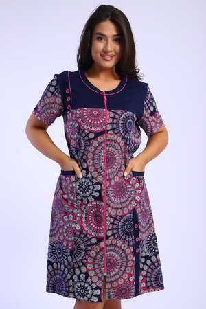 Удобный домашний женский халат из легкой хлопковой ткани создан для настоящих ценительниц качества и стиля! Это именно та домашняя одежда, в которой комфортно готовить еду, заниматься уборкой, стиркой и прочими бытовыми делами. Дизайн халата представляет собой удачную комбинацию однотонной ткани и ткани с ярким цветочным мотивом, основное полотно освежают и красиво дополняют декоративные вставки. Дополнительным декором халата служат планки с рядом пуговиц на полочке и подоле. Халат застегивается на молнию, поясок завязывается сзади. Короткий рукав позволяет носить халат в жаркое время года дома и на даче.