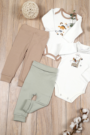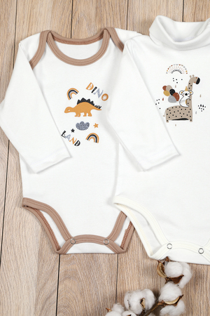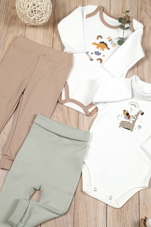 2 комплекта из боди с веселыми принтами, у одного из которых горловина выполнена ввиде лодочки, а второй сделан водолазкой. Боди с длинным рукавом для новорожденных и штанишек тоже разного вида, одни на манжете и широком поясе с резинкой, вторые штанишки растущие, на которых отгибаются манжеты и пояс увеличивая размер. Отличная двойка для девочек и мальчиков - самая незаменимая базовая вещь в гардеробе малыша. Детский набор изготовлен из натуральной ткани - высококачественного 100% хлопка. Идеально подходит для нежной кожи младенца. Представлен в разных расцветках. Мягкий трикотаж белья обеспечивают удобство для малышки. Кнопки сделают легкой застежку и снятие. Широкая резинка не давит на живот, не доставляет дискомфорт. Можно носить в летний, осенний и зимний сезоны. У слипика удобная горловина в виде лодочки, что позволяет свободно одеть через голову крошки не причиняя дискомфорт. Можно носить по отдельности. Превосходная пижама для сна: подгузник можно быстро сменить, не побеспокоив ребенка. Не сползает, не заворачивается. Лучшая поддева под утепленный теплый комбинезон. Подготовьте сюрприз беременной жене, купив комплект для дочки или сыночка. Не потускнеет, не порвется после многочисленных стирок. Устойчив к глажке. Правильный подбор вещей для малыша - залог его комфорта, а также спокойствия для мамы и папы!