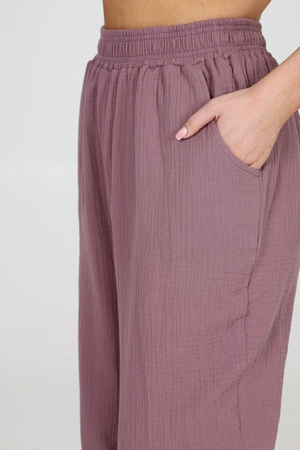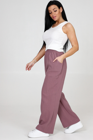 Брюки женские из муслина свободного покроя, на притачном поясе и с боковыми карманами.