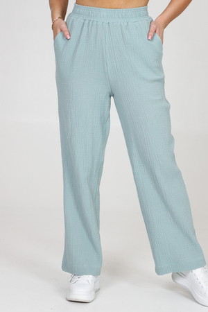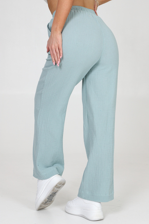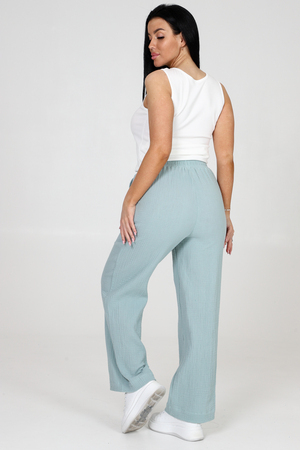 Брюки женские из муслина свободного покроя, на притачном поясе и с боковыми карманами.