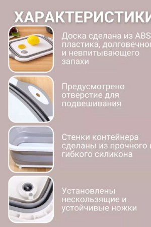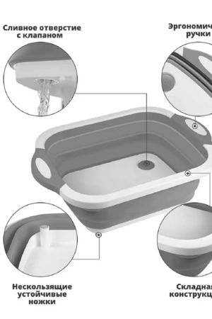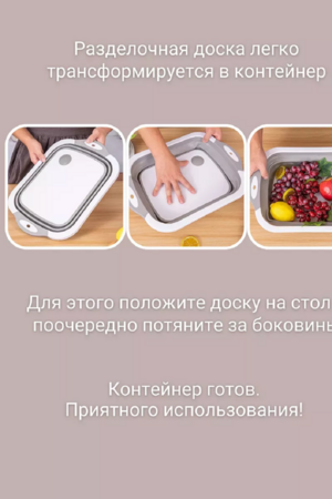 Многофункциональная складная разделочная доска 3 в 1, изготовлена из прочного пищевого пластика и силикона, безопасна. Изделие сочетает функции кухонной миски, небольшого тазика, дуршлага и складной разделочной доски. Объем чаши 6 литров. Может использоваться в качестве корзины под фрукты и овощи и доски для подачи закусок, бутербродов. Разделочная доска трансформер с ножом отличается удобством в применении. Подходит для кухни, дачи, для путешествия, пикника на природе. Доска-дуршлаг - отличный подарок маме, сестре, бабушке или себе на любой повод будь то новоселье, свадьба, день рождения. Незаменима не только на кухне, но и во время похода или пикника. В сложенном состоянии не занимает много места и применяется как досочка для резки продуктов. При этом доска разделочная пластиковая силиконовая не тупит ножи, не впитывает запахи, легко моется. Потянув за края легко превращается в контейнер со сливом. В котором можно хранить и мыть овощи, фрукты и другие продукты. Воду можно слить, нажав клапан на дне тазика, можно использовать для замачивания и стирки белья. Прочное пластиковое дно с нескользящими ножками, крепкие силиконовые бортики делают изделие устойчивым. Разрешено ё мыть в посудомоечной машине.