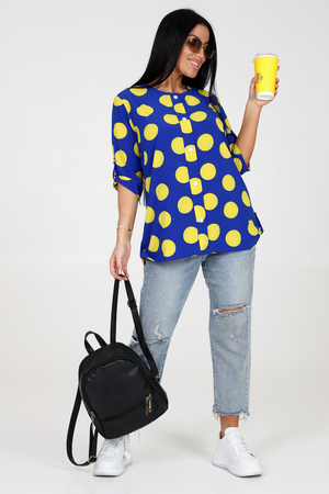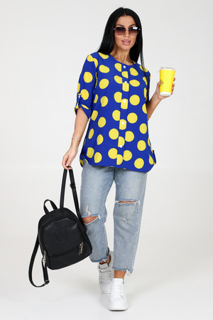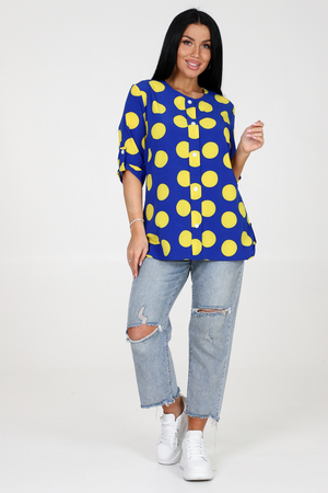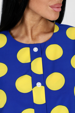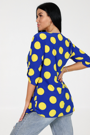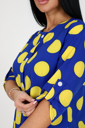 Женская туника свободного кроя из ткани прадо - удобная и стильная многофункциональная одежда для модных женщин. Изготовлена из высококачественной ткани, состоящей на 97% из полиэстера и 3% из эластана, она обеспечивает комфорт и отличную посадку. Эта модель туники имеет полочку, которая украшена планкой с декоративными пуговицами, добавляющими особый шарм к изделию. Выточки на полочке придают ей дополнительно аккуратный и женственный вид. Рукава и низ изделия завершены патами, что создает интересный и элегантный общий образ. Туника также украшена стильным рисунком в виде гороха, который придает ей игривость и неотразимость. Благодаря свободному крою, она позволяет чувствовать себя комфортно и свободно в любой ситуации. Эта туника идеально подходит для создания разнообразных образов - от повседневного до официального. Ее универсальность и классический дизайн делают ее незаменимой частью гардероба каждой модницы.