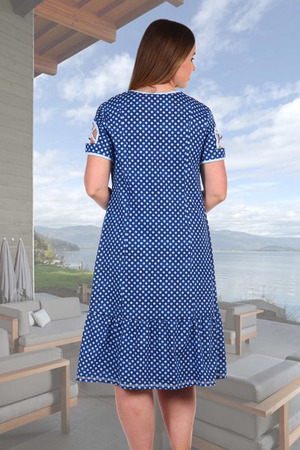 Платье полуприлегающего силуэта из кулирки. Оборка по низу, фигурная горловина. Рукав втачной, короткий на манжете, с декоративным вырезом. Горловина, манжет и декоративный вырез рукава обработаны бейкой из отделочного полотна. Несколько вариантов дизайна.