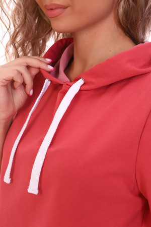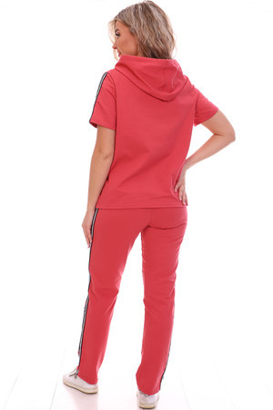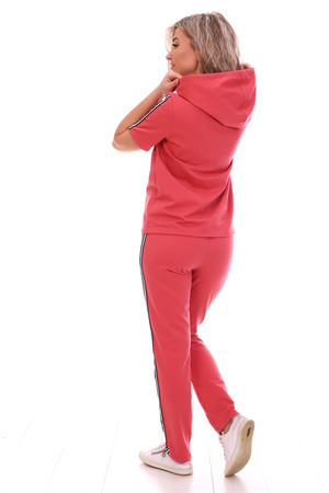 Костюм состоит из кофты с коротким рукавом и брюк. Кофта свободного кроя с капюшоном. Брюки прямого силуэта на удобной поясной резинке. Украшением костюма являются лампасы.