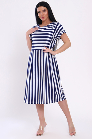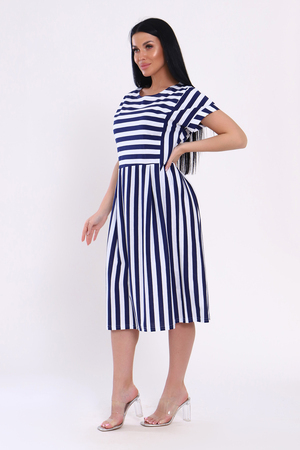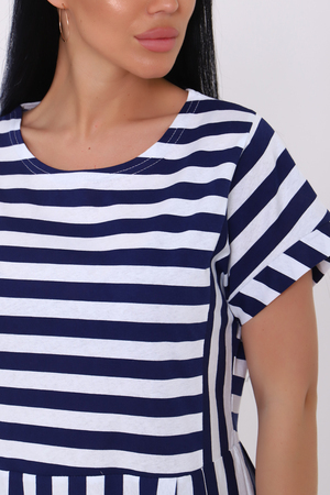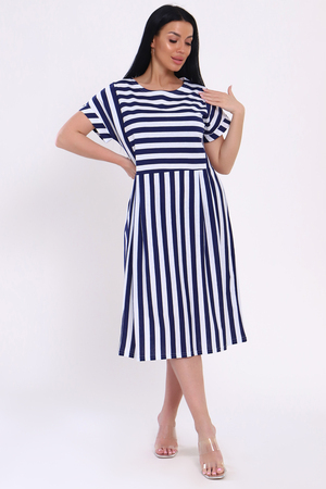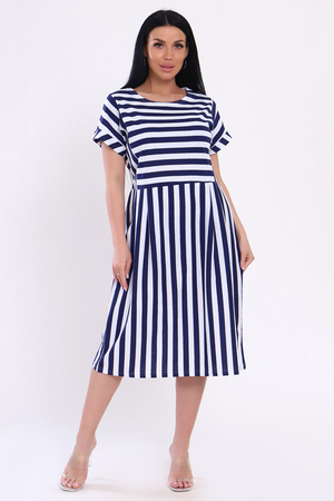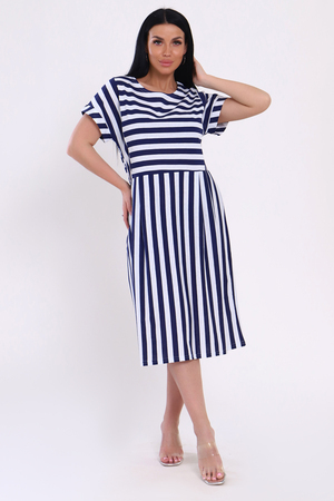 Платье женское из кулирки с принтом в виде ярких широких полос. Модель свободного кроя, с завышенной отрезной талией со складками. Круглая горловина, спущенная пройма обработана широким манжетом, на передней полочке рельефы. Разное направление полос делает платье стильным и привлекательным. Лёгкое, воздушное, приятное к телу платье, необходимая вещь в женском летнем гардеробе.