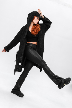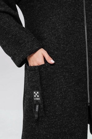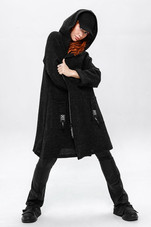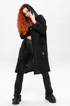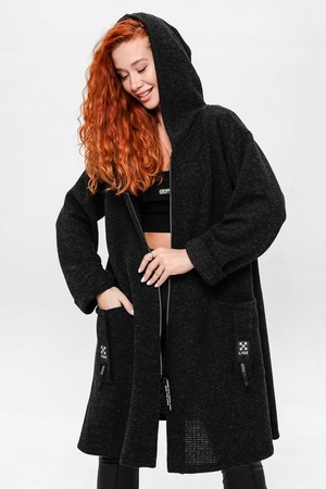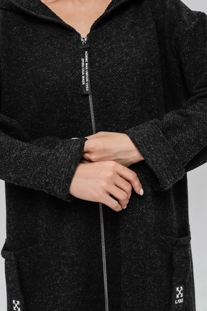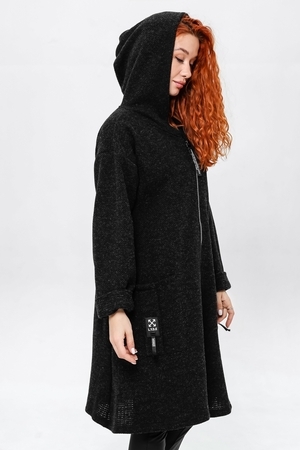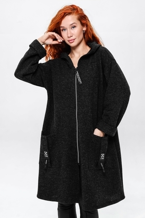 Кардиган на застёжке молния с двумя накладными карманами и объёмным капюшоном.Длинные широкие рукава, у которых вы сможете сами отрегулировать нужную вам длину завернув их по длине вашей руки. Вы можете носить его,как самостоятельную вещь или сочетать с топом и футболкой.Отлично смотриться с легинсами,джинсами,кожаными брюками.