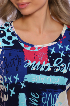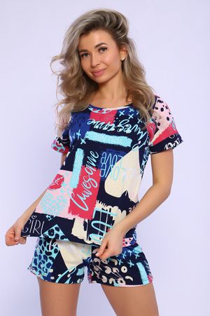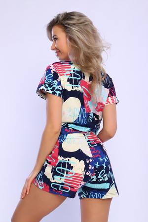 Костюм состоит из футболки и шорт. Футболка свободного кроя с манжетами на спущенном плече.
