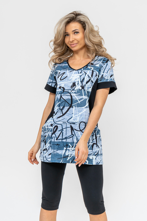 Женский костюм полуприлегающего силуэта состоит из туники и бриджей. 100% дышащий хлопок туники и эластичная вискоза бриджей несут в себе удобство при носке, гигроскопичность и износостойкость. V-образный вырез горловины придаёт изделию женственный вид. Для удобства туника имеет вместительные накладные карманы и втачные рукава с манжетами. Рельефы на полочке изделия создают идеальную посадку и безупречный внешний вид. Бриджи на резинке с высокой посадкой. В костюме такого плана Вы будете чувствовать себя комфортно как дома, так и на любимой даче. Эта двойка идеально подойдет для летнего отдыха на даче, на море или просто для девушек, которые хотят чувствовать себя уютно и комфортно дома. Летний женский костюм подходит для поездок и путешествий, загородного отдыха на природе, а также для получения лечения в больнице или санатории. Повседневное хлопковое изделие с бриджами - отличная идея для подарка любимой жене, маме, сестре или подруге на день рождения, 8 Марта или по любому другому приятному поводу. Рекомендация: для того чтобы продлить яркую жизнь