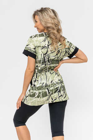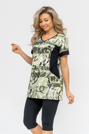 Женский костюм полуприлегающего силуэта состоит из туники и бриджей. 100% дышащий хлопок туники и эластичная вискоза бриджей несут в себе удобство при носке, гигроскопичность и износостойкость. V-образный вырез горловины придаёт изделию женственный вид. Для удобства туника имеет вместительные накладные карманы и втачные рукава с манжетами. Рельефы на полочке изделия создают идеальную посадку и безупречный внешний вид. Бриджи на резинке с высокой посадкой. В костюме такого плана Вы будете чувствовать себя комфортно как дома, так и на любимой даче. Эта двойка идеально подойдет для летнего отдыха на даче, на море или просто для девушек, которые хотят чувствовать себя уютно и комфортно дома. Летний женский костюм подходит для поездок и путешествий, загородного отдыха на природе, а также для получения лечения в больнице или санатории. Повседневное хлопковое изделие с бриджами - отличная идея для подарка любимой жене, маме, сестре или подруге на день рождения, 8 Марта или по любому другому приятному поводу. Рекомендация: для того чтобы продлить яркую жизнь