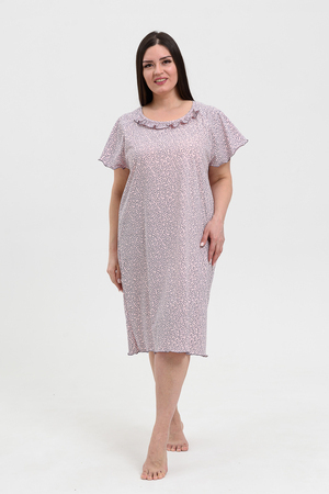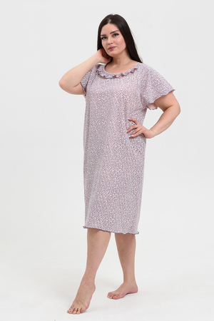 Сорочка женская больших размеров с симпатичной рюшей по горловине. Очень свободный и удобный крой. Рукав-реглан, не стесняет движения рук. Обработка рукава и низа изделия в виде лёгкой волны придаёт лёгкость и воздушность.