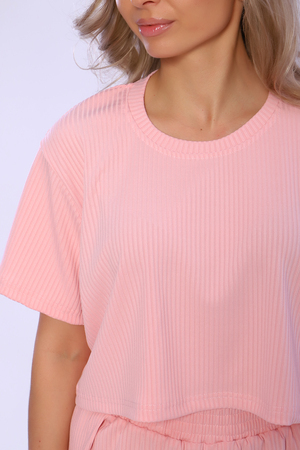 Пижама состоит из футболки и шорт. Футболка свободная, укороченная с короткими рукавами. Шорты свободные с запахом по бокам.