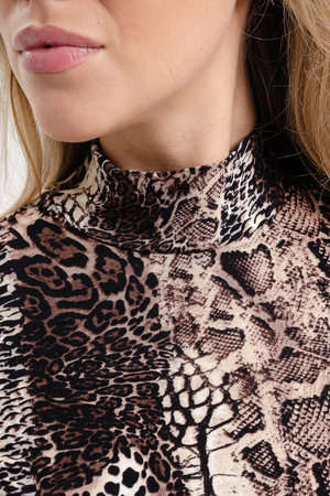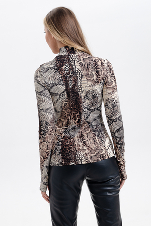 Водолазка - базовый элемент гардероба, который создаёт лаконичный образ и становится нежным дополнением к женственному изящному луку. Модель выполнена из мягкой вискозы, ткань лёгкая в уходе, хорошо тянется, что придаёт комфорт в движении и удобство в использовании. Благодаря приталенному крою и эластичным свойствам ткани, наша водолазка облегает фигуру. Воротник-стойка имеет комфортную высоту и плотно прилегает к шее. Современный тренд стиля и комфорта - длинный рукав с прорезью под пальчик создаёт уютный и изящный образ. Принт, имитирующий змеиную кожу, не оставит вас равнодушной, универсальность этой расцветки позволяет сочетать её с разнообразной цветовой палитрой и элементами одежды.
