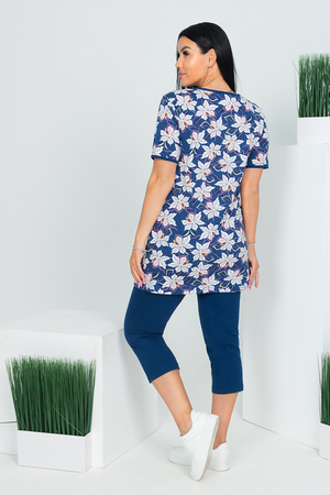 Костюм женский из кулирного трикотажного полотна состоит из туники и бридж. Туника полу прилегающего силуэта, слегка расширенная к низу, длиной до середины бедра. Рукава втачные короткие. Боковые карманы с окантованным входом. Горловина округлой формы и низ рукава окантованы отделочным полотном. Бриджи базовые, облегающие фигуру, длиной до середины икр.