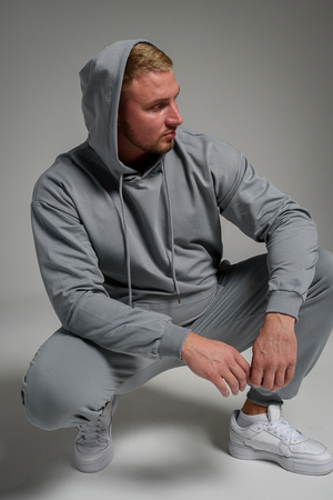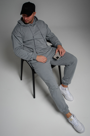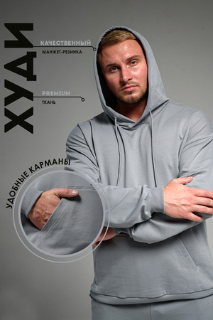 Костюм спортивный мужской с худи и джоггерами. Костюм свободного кроя состоит из толстовки с капюшоном и карманом кенгуру и брюк джоггеров на манжете с карманами в боковых швах. Костюм однотонный сшит из качественного хлопкового трикотажного материала - футера 2-х нитки. Обладает отличной эластичностью, не сковывает движений. Идеален для занятий спортом. Зимой костюм возможно носить в тренажерный зал или использовать как домашнюю одежду.