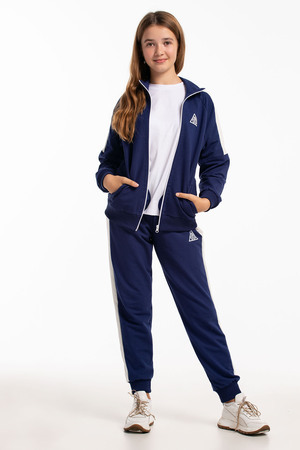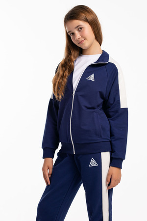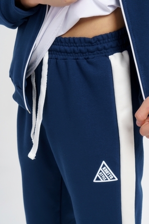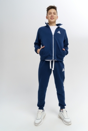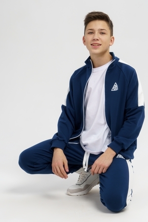Костюм двойка из футера 2-х нитки качество пенье. Состоит из олимпийки с карманами и манжетами на рукавах и брюк без карманов. Крой свободный. Олимпийка и спортивные брюки декорированы контрастными лампасами по низу изделия манжеты. Олимпийку дополняет принт.