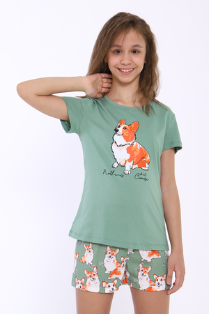 Пижама с шортами для девочки арт. ПД-023-062 Корги на зеленом