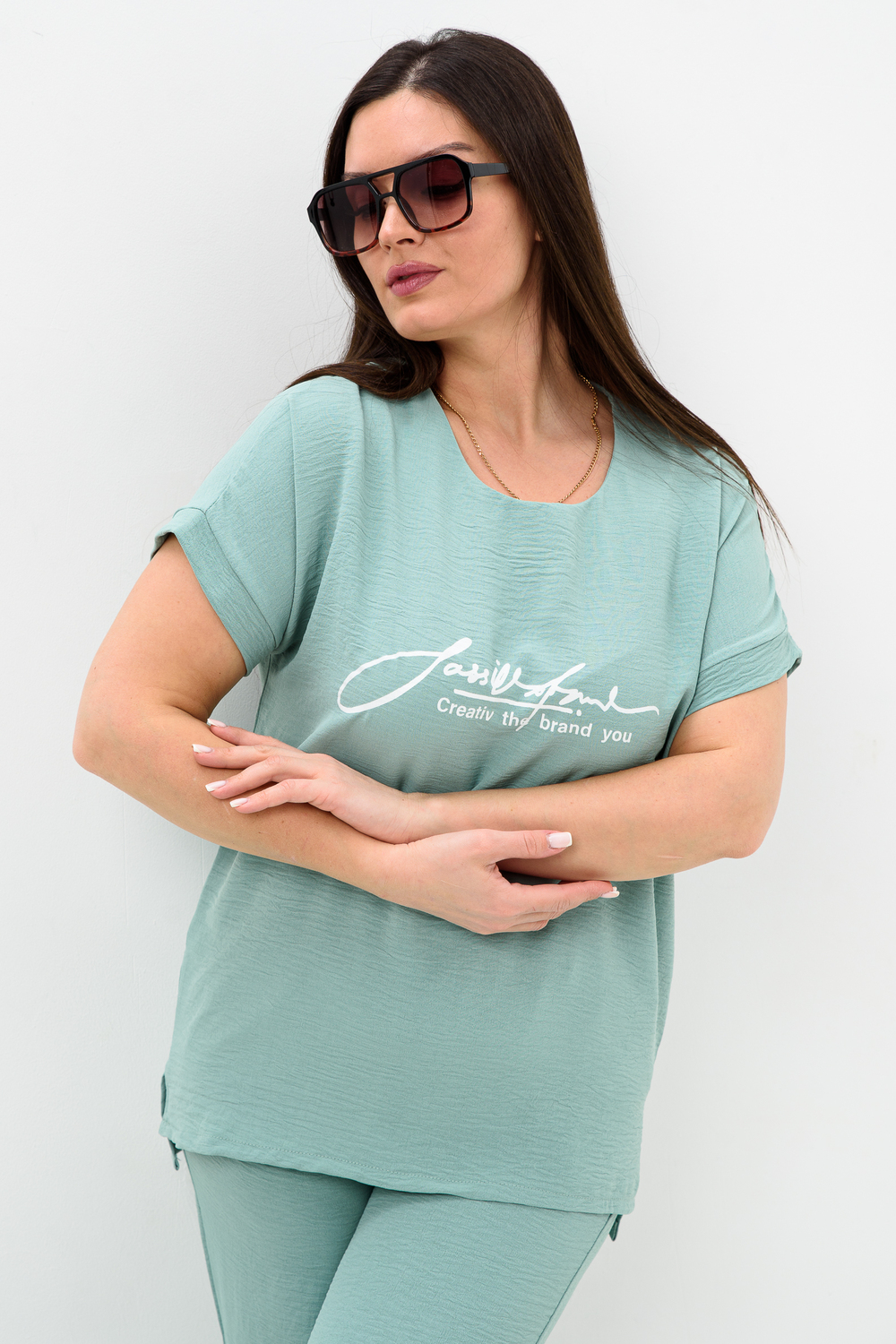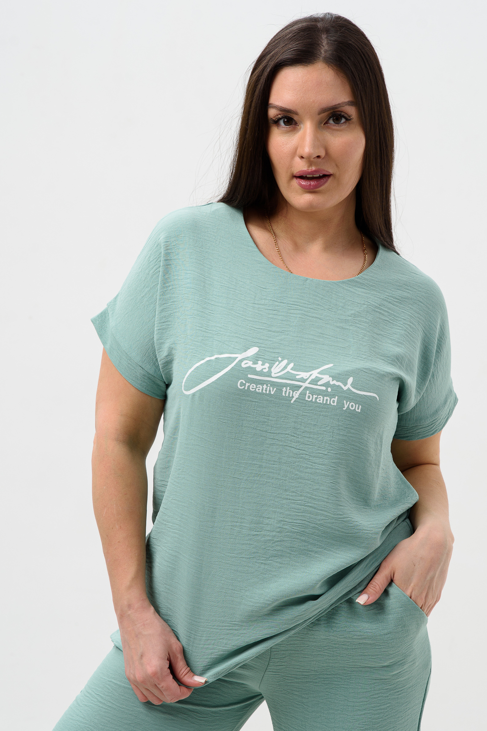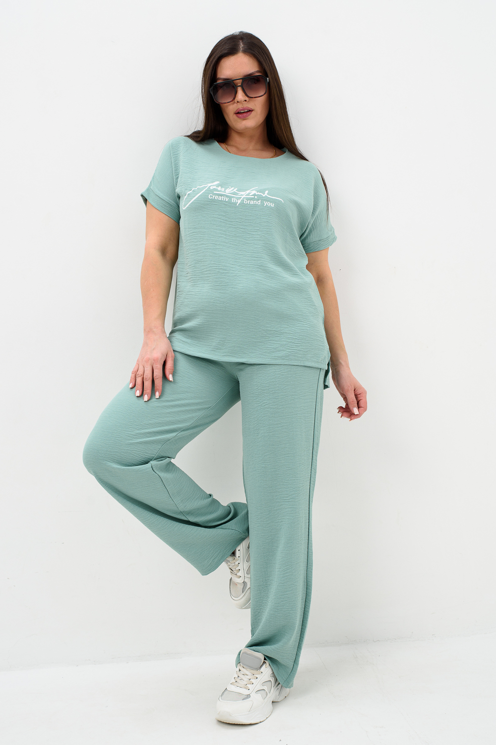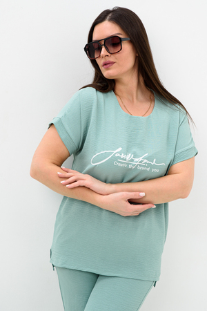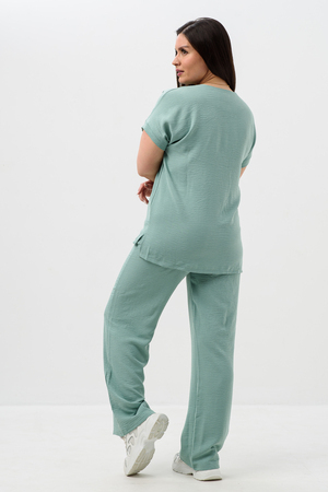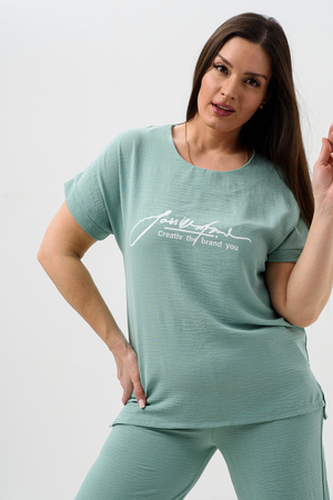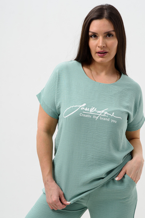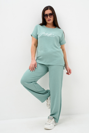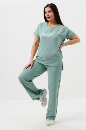 Женская двойка прямого кроя. Футболка костюма с коротким цельнокроеным рукавом, округлой горловиной и принтом на передней полочке, брюки с поясом на резинке (4 см) и карманами. Комплект достаточно свободный, поэтому подойдет для повседневной носки, как и для дома, так и на прогулку. Костюм представлен в двух приятных расцветках, выполнен из легкой ткани - сингапур, что идеально подойдет для жаркой погоды, красивый, но при этом простой и удобный.