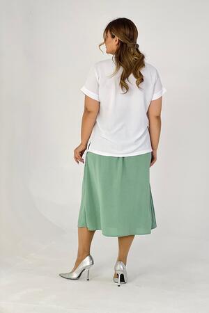Женская двойка прямого силуэта. Верх комплекта в белом цвете с цветным принтом, короткий цельнокроеный рукав, низ футболки имеет свойство затягиваться, поэтому ее можно носить спущенную на юбку, а можно затянуть и оставить над ней, что подчеркнет вашу талию. Низ - свободная юбка двух цветов, с двумя разрезами снизу. Костюм повседневный и удобный, из легкой ткани сингапур, что хорошо для жаркого лета.