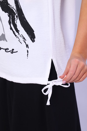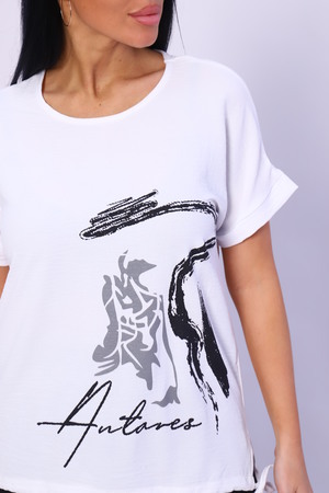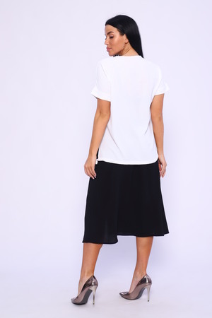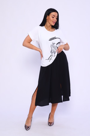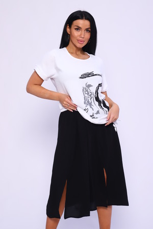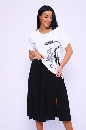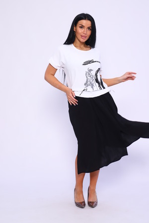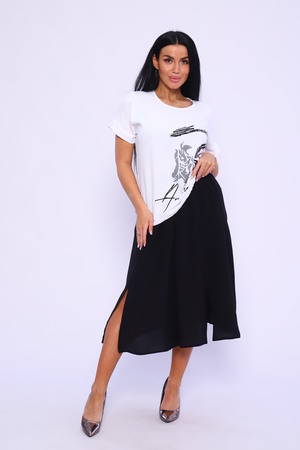 Женская двойка прямого силуэта. Верх комплекта в белом цвете с цветным принтом, короткий цельнокроеный рукав, низ футболки имеет свойство затягиваться, поэтому ее можно носить спущенную на юбку, а можно затянуть и оставить над ней, что подчеркнет вашу талию. Низ - свободная юбка двух цветов, с двумя разрезами снизу. Костюм повседневный и удобный, из легкой ткани сингапур, что хорошо для жаркого лета.