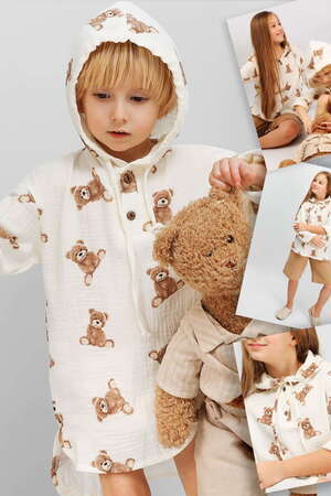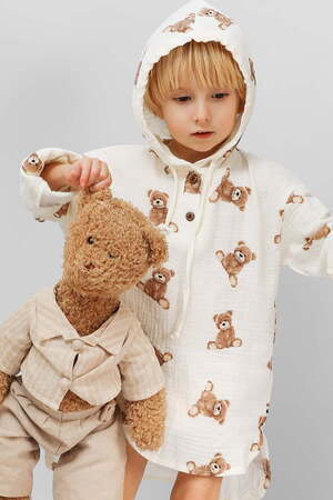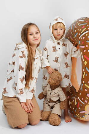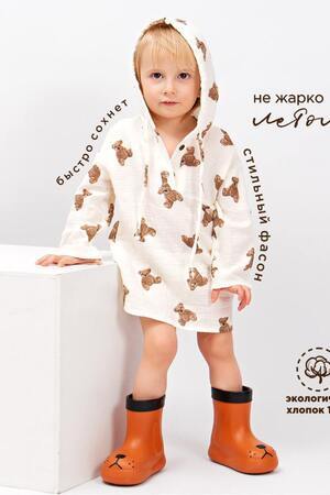 Модная, детская туника Соль&Перец свободного кроя, с капюшоном и асимметричной линией низа. На горловине и на рукавах застежки-пуговицы (кокос). Ткань-двухслойный муслин, хорошо пропускает воздух, защищает от солнца, идеально подходит для чувствительной кожи. Отличный выбор для прогулок, на пляж, в детский сад, для дома и на каждый день.