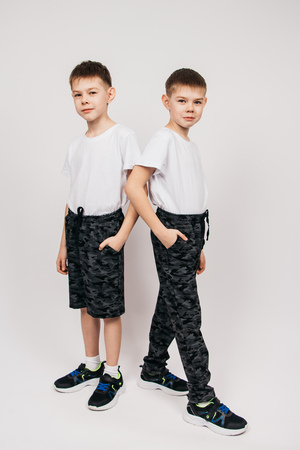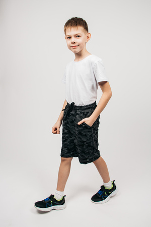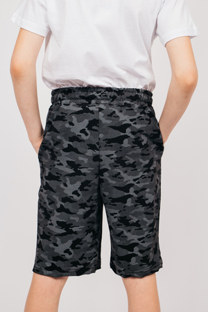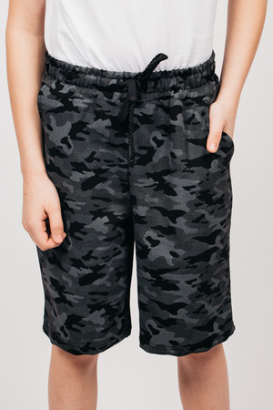 Шорты детские с модным в этом сезоне камуфляжным принтом подойдут любому ребенку, который любит собирать модные и удобные образы. Пояс отрезной, с резинкой и шнуром внутри. Шорты с карманами на передней половинке с отрезным бочком. Изготовлены из петельчатого футера с добавлением полиэстера и эластана.
