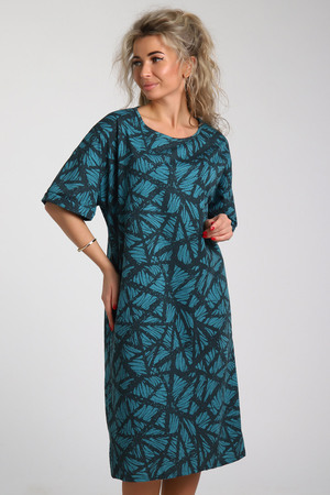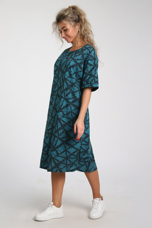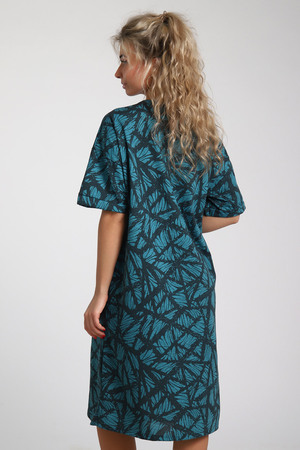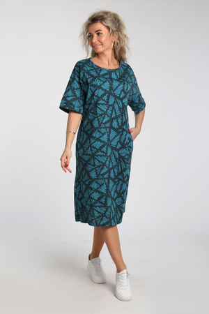 Платье из хлопковой кулирки, Силуэт прямой, два боковых кармана, рукава короткие на базе спущенного плеча. Контрастный орнамент в насыщенных гармоничных тонах.