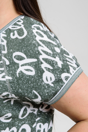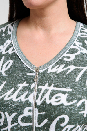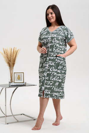 Халат с застежкой на молнию, полуприлегающего силуэта, длиной ниже колена, с V-образной горловиной, с накладными боковыми карманами. Рукав спущенный, короткий. В верхней части полочки расположены кокетки. Спинка с кокеткой. В нижней части боковых швов обработаны разрезы. Горловина, проймы и верх карманов обработаны бейкой из отделочного полотна с белым кантом и декоративной строчкой.