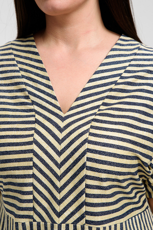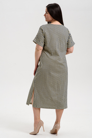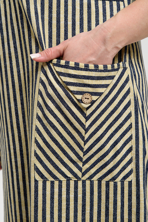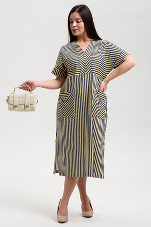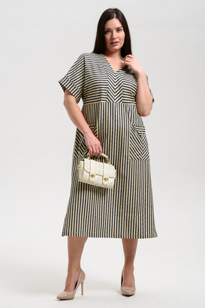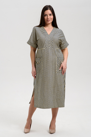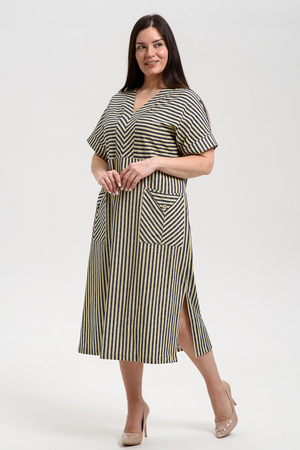 Платье прямого силуэта, с V-образной горловиной спереди, с декоративными элементами на накладных карманах, с разрезами в нижней части боковых швов. Рукав цельнокроеный, короткий, с манжетом. Горловина полочки обработана обтачкой. Горловина спинки и верх карманов обработаны бейкой из основного полотна.