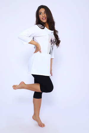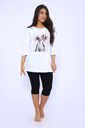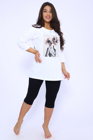Футболка женская удлиненная прямого силуэта из кулирки 100% хлопок качества пенье. Спереди оригинальный принт, рукав спущенный 3/4, горловина обработана обтачкой, затягивается шнурком. Футболка идеально подойдет как для дома, так и для прогулок и отдыха.
