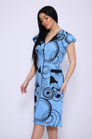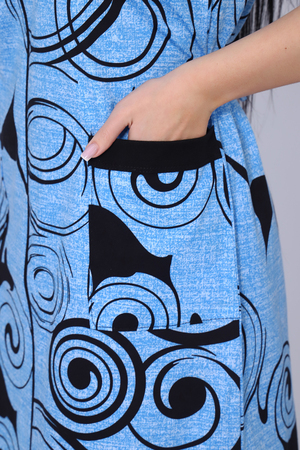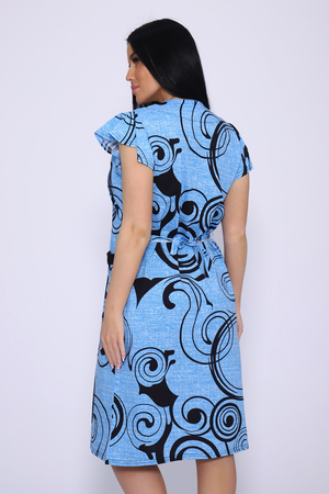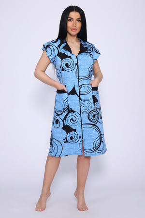 Оригинальный женский халат с красивым принтом на ткани. Рукав короткий в форме крылышка, с накладными карманами, отложной треугольный воротник. Застежка-молния, длина ниже колена, очень приятный к телу.