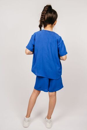 Нарядный костюм для девочек на лето выполнен из ткани сингапур. Комплект одежды состоит из рубашки прямого силуэта, плечо удлинено, с короткими рукавами и удлинёнными шортами на резинке. Блузка застегивается на пуговицы, имеет накладной карман. Свободные шорты оснащены двумя боковыми карманами. Крутой трикотажный костюм уместен летом, на день рождения, вечерние прогулки и фотосессию. Отлично подойдет на девочку подростка, как трендовый подростковый костюмчик. После стирки возможна усадка изделия. Состав: 92% полиэстер, 8% эластан. Плотность 170 гр.