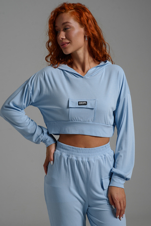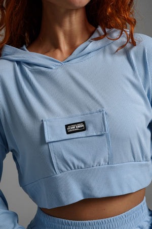 Стильное укороченное худи с капюшоном и длинными рукавами выполнено из очень мягкой приятной к телу ткани в мелкий рубчик. Худи свободного кроя с маленьким кармашком с клапаном на груди. Отлично сочетается с майками, топами, спортивными брюками, шортами, юбками.