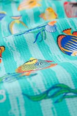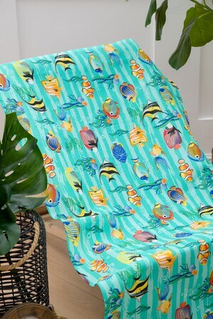Это пляжное полотенце с рыбками - идеальный выбор для вашего отдыха на пляже или в бане. Размер 80*150 см делает его удобным и практичным для использования как полотенце для пляжа, так и накидки на шезлонг.
