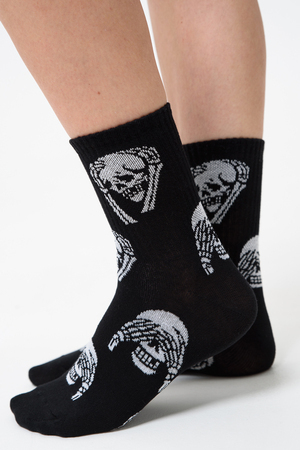 Женские носки с изображением черепов. Широкая резинка по всей верхней части носка. В комплекте 1 пара.
