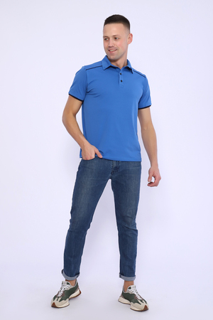 Поло мужское из кулирки с лайкрой 92% хлопок 8 % лайкра. Поло с рубашечным воротником, планка на пуговицы, на спинке кокетка, отделочные детали и кант на плечах и кокетке из темно-синего трикотажа. Футболка отлично подойдет для дома и отдыха.
