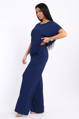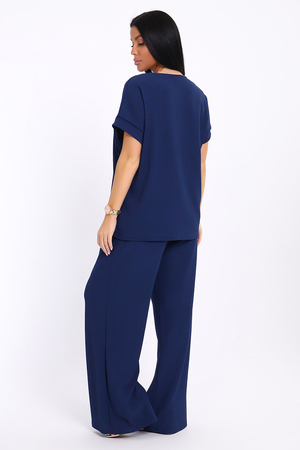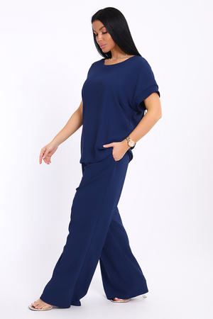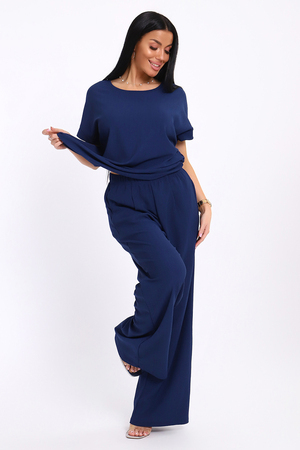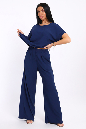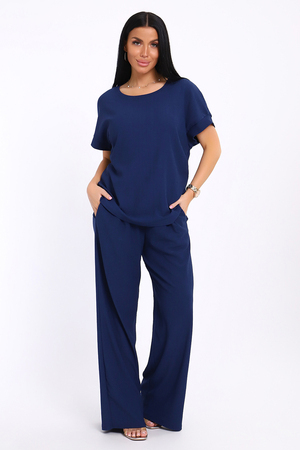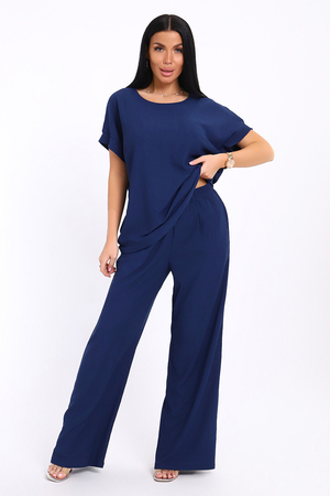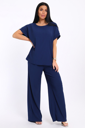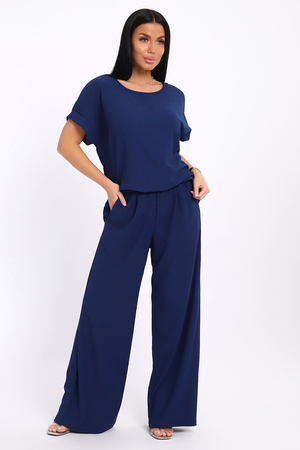 Брюки палаццо и футболка со спущенной проймой и с круглым вырезом горловины из тонкого, струящего материала - жатка. Такой красивый модный костюм не оставит равнодушной ни одну модницу. Вещи представлены стандартных и больших размеров для дам с пышными формами. Расклешенные брючки с завышенной талией на резинке с карманами отличаются удобным кроем, они стандартной длины и превосходно садятся по фигуре женщин, визуально удлиняют ноги и придают силуэту идеальные очертания. Благодаря наличию нагрудных вытачек футболка идеально садиться по фигуре.
