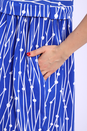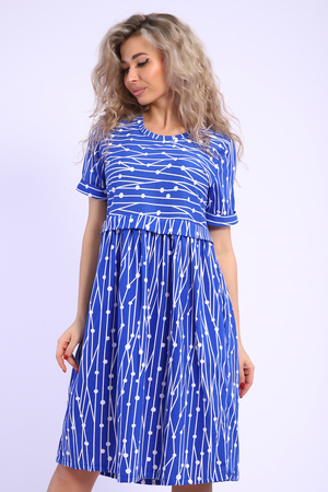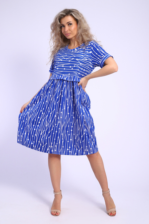 Платье полуприлегающего силуэта с короткими рукавами. Рукава с отворотными манжетами. Юбка свободная, на сборке. В боковых швах удобные карманы.