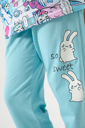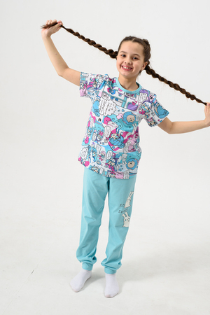 Пижама для девочки состоит из свободных брюк и футболки. Домашний костюм для подростков без карманов выполнен из мягкого, легкого и комфортного трикотажа средней плотности, не сковывает движений. Манжеты на штанах надежно фиксируются и не позволяют детской одежде сползать, что придаёт дополнительное удобство при носке. Брюки выполнены на резинке, мягко и приятно прилегают к телу, не давит на живот и не вызывает дискомфорта. Комплект не садится после стирки, не линяет и не теряет яркости красок. Домашняя одежда для малышей с рисунком добавит яркости и радости в повседневную жизнь.