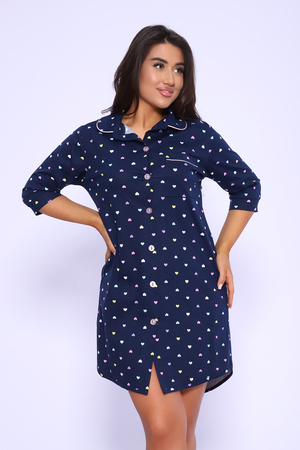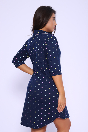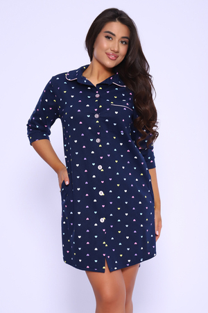 Халат прямого силуэта на пуговицах. Воротник на стойке, закругленный с кантом. Рукава 3/4 с притачными манжетами. Карманы в боковых швах. На груди кармашек с отделочным кантиком. Низ халата обработан бейкой из основной ткани и закруглен к боковому шву. Спинка длиннее переда. Халат прекрасно подойдет для дома, дачи и отдыха.