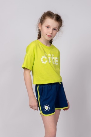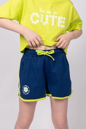 Модные и удобные трикотажные шортики - отличный выбор для девочек на летний сезон и для занятий спортом. По поясу шорт вставлен плоский утягивающий шнурок, что придает модели дополнительный акцент. На правой передней половинке шорт принт шелкография – милая ромашка. Надпись переводится как "Это хороший день; Хорошего дня". Эти шортики для девочек идеально подходят для повседневных летних прогулок.
